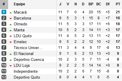 Profitant des reports des rencontres de Barcelona et Emelec, deux des leaders du championnat, Macará part s’imposer à Quito face à la LDU lors de l’affiche de la 11e journée sur un but inscrit par Marcos Pirchio dans les ultimes secondes et prend seul la tête du tournoi.