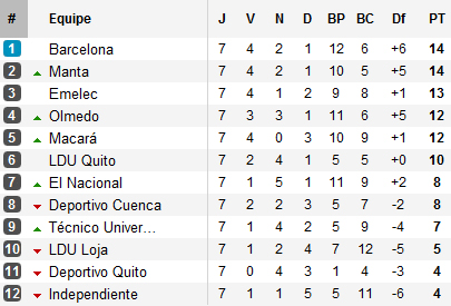 Modestes neuvièmes de la première phase comme ils le furent lors des deux tournois précédents, les Celestes de Manta profitent de la septième journée pour revenir sur le leader Barcelona en arrachant le nul chez eux devant El Nacional.