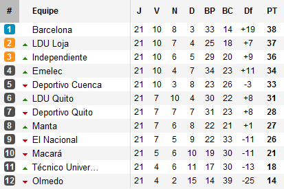 Restent donc trois équipes. Leader avant la journée, Independiente se fait surprendre par le Deportivo Cuenca et compromet sérieusement ses chances de victoire. Car dans le même temps, la LDU Loja s’impose sur le terrain d’El Nacional grâce à un triplé de Fabio Renato et Barcelona domine tranquillement Técnico Universitario (3-0). Conséquence, les Toreros de Guayaquil ne sont plus qu’à quatre-ving-dix minutes de la victoire.