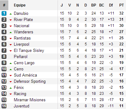 Nous avions laissé l’Apertura 2013 uruguayen au lendemain du Clásico et de la victoire du Peñarol privant le Nacional de prendre les commandes du tournoi après la victoire de la sensation River Plate sur le terrain du leader d’alors : Danubio. Nacional, Danubio, River Plate, les trois leaders d’alors se livraient à une lutte énorme lors de l’ultime journée du tournoi. Leader, River Plate se rendait au Defensor alors qu’ex-aequo, le Nacional avait semble-t-il tâche plus facile avec la réception de Fenix, le grand consommateur d’entraîneur du tournoi (3). Danubio enfin, se déplaçait sur le terrain de Sud America, champion sortant de D2 presque centenaire. Au coup d’envoi donc, River devant, Nacional à sa hauteur (mais devancé d’un but) et, à un point, Danubio.
