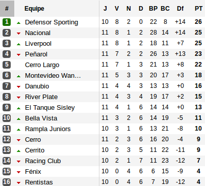 Nacional, Peñarol, Defensor Sporting, trois favoris de l'édition 2012 présents aux quatre premières places, trio qui pour l'instant sera le trio représentant l'Uruguay lors de la prochaine Libertadores, le Defensor Sporting, actuel troisième qualifié (au classement général de la temporada 2011-2012) comptant un point d'avance sur son adversaire du week-end : le Cerro Largo.