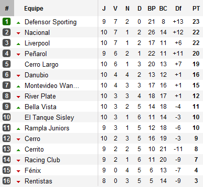Le Defensor Sporting enchaîne trois succès consécutifs, le Nacional quatre et tous deux doublent les Negriazules. Reste Peñarol, désormais à trois points du leader mais qui pourrait venir doubler le Nacional s’il s’impose jeudi prochain face à Rentistas quasiment condamné à la relégation. Defensor Sporting, Nacional, Peñarol, le sort de Liverpool pourrait bien être scellé ce week-end au Centenario pour le choc au sommet opposant Negriazules et Carboneros.