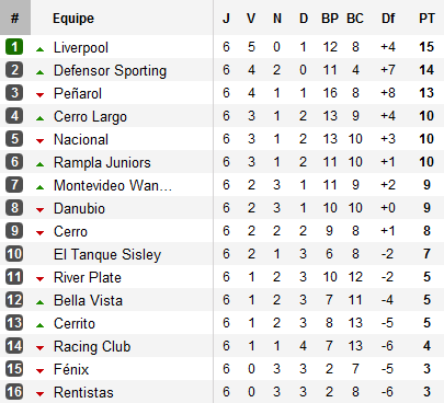Fort heureusement pour Liverpool, mise à part le Defensor Sporting, ni Peñarol, ni le Nacional n’en profitent. Les Carboneros s’inclinent à Danubio sur un triplé de Diego Martiñones pendant que les hommes de Gallardo s’inclinent lourdement sur le terrain du Cerro Largo, autre grand gagnant de la journée. Avec le nul entre Defensor Sporting et Peñarol en match en retard disputé en milieu de semaine, ils sont désormais six à se tenir en cinq points.