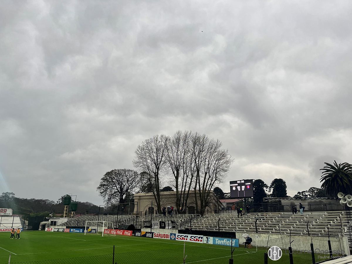 Un homme fort peu recommandable a parlé de l’Argentine en ces termes : un vertige horizontal. Les Uruguayens ne l’admettront jamais, orgueil oblige, mais le même sentiment domine. Terre particulièrement plate, pas de relief, aucun bâtiment ne s’élevant de terre pour gratter le ciel et donc ce dernier paraît plus grand qu’ailleurs. Tout cela pour dire que le Parque Alfredo Victor Viera n’est pas plat. Je prenais comme d’habitude des photos où le ciel prend une place plus importante que la terre, une photo ou apparaissait pour le coup des nuages tordus en six arabesques au-dessus des buts adverses et je n’arrivais pas à ce que le premier plan apparaisse comme un plan horizontal. C’est que, et personne ne s’en est sans doute rendu compte, mais le Parque Alfredo Victor Viera penche vers le Miguelete, petit ruisseau apportant l’eau potable à Montevideo et parcourant le parc Prado. Le terrain du Viera, au sein de ce dernier, n’est pas plat. Le football est un sport flexible, dans lequel même les dimensions du terrain sont, dans une certaine mesure, à l’appréciation de l’équipe hôte. J’imagine que le terrain respecte les normes en vigueur, qu’il n’est « qu’un peu » penché. Cette réflexion m’a pris toute une mi-temps, la première de Wanderers – Albion, une mi-temps commencée à 10 heures du matin, ceci expliquant sans doute cela. Il a plu toute la nuit, très exactement jusqu’au coup d’envoi. Wanderers – Albion, deux des plus vieilles équipes du championnat d’Uruguay, passées par tant de gloires et de chutes (surtout pour Albion). Rien d’exceptionnel, pour ne pas dire rien du tout, en première mi-temps. Seul un penalty pour une supposée main annulé un long passage de visionnage et d’analyse de la K7 apporte un peu de piment au match.