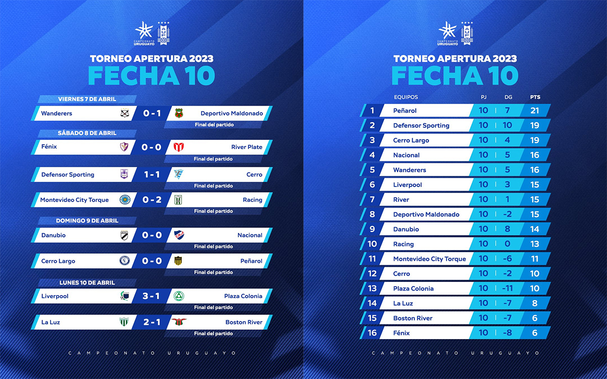 Peñarol continue sa course en tête avec un match nul contre son dauphin Cerro Largo au terme d’une rencontre que les Carboneros auraient pu remporter avec un peu plus de réussite. Nacional fait aussi un match nul, un match un peu plus inquiétant au vu de la performance soporifique contre Danubio… Le classement reste identique mais l’échéance se rapproche.