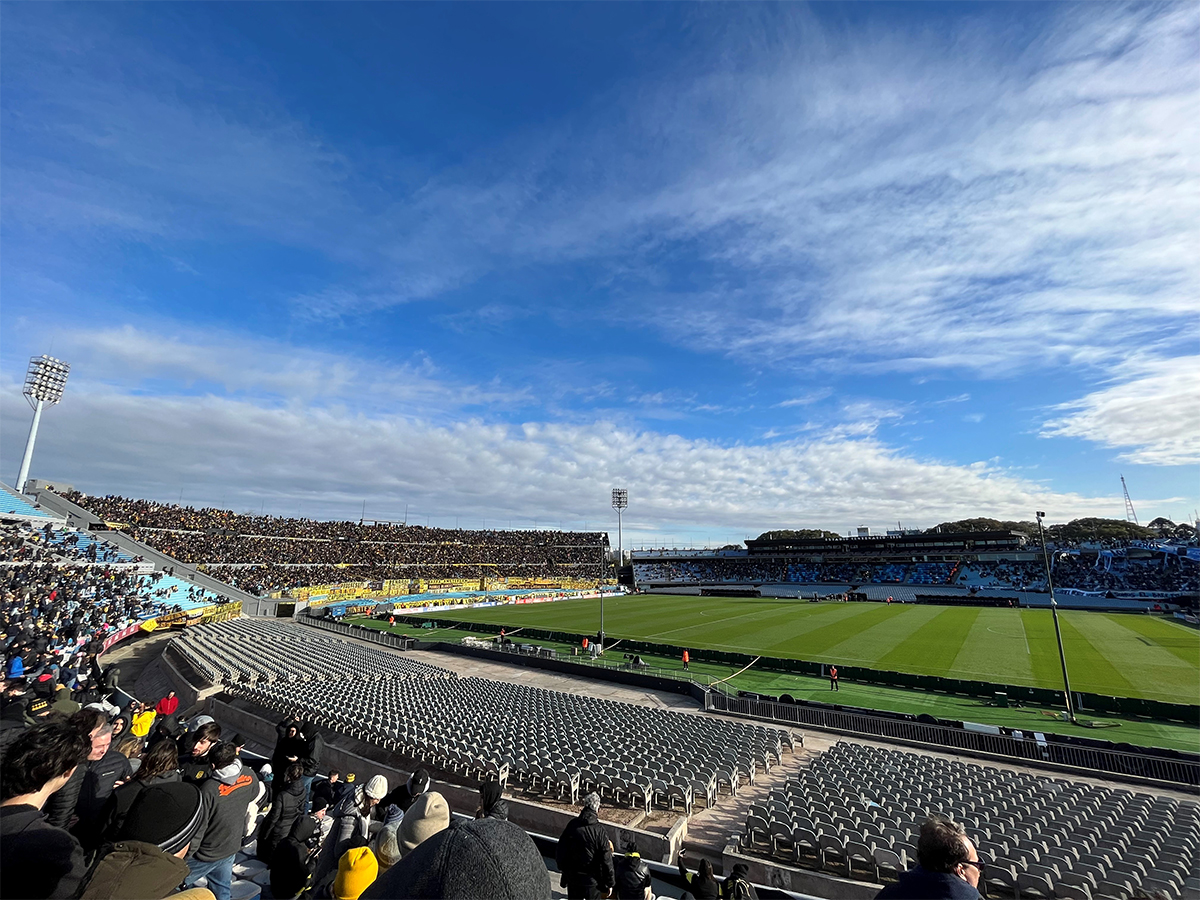 En première mi-temps, Peñarol a le vent et le soleil couchant de face. Cela se sent immédiatement avec quelques imprécisions au niveau des passes, jusqu’au quart d’heure de jeu quand Rodrigo Saravia joue mal un coup franc dans les pieds, dans l’axe du terrain, alors que toute l’équipe était montée. Nahuel Acosta en profite pour débouler en contre et trouver Dylan Nandin pour l’ouverture du score. Surprise dans le stade. Le pauvre Saravia en prend pour son grade, tout comme le reste du milieu de terrain qui semble perdu en cette première mi-temps avec un Cristoforó, lui aussi, dans le doute. Peñarol ne se trouve pas dans la largeur du terrain et est en danger dès qu’il y a un contre, avec la vitesse d’Acosta (que l’on avait vu du côté de Rentistas) ou de Nandin (dont on avait déjà parlé depuis avant la descente du club en 2020 au côté, à l’époque, d’un certain Bryan Bentaberry). Le match tourne avec le changement de côté. C’est criant sur le but d’Hernández à la 51e sur un centre porté par le vent et qui lobe le pauvre Dario Denis, plutôt bon jusque-là. On pense alors que Peñarol a quarante minutes pour marquer un but mais Cerro se replie bien et limite l’impact des conditions climatiques en jouant bas puis en sortant rapidement balle au pied dans l’axe. Peñarol ne retrouve le danger qu’avec l’entrée en fin de match de Kevin Méndez, obtenant corner sur corner… Ce qui n’arrange personne car le match se joue avec, d’après nos estimations, seulement cinq ballons, dont un qui termine dès la première mi-temps sous la bâche de la tribune Colombes et un autre envolé dans le ciel Montévidéen lors du but d’Hernández. Autant dire qu’il n’y avait presque plus de ballon à la fin du match et que l’on a donc vu des joueurs de Peñarol plonger dans la « piscine » de la tribune Amsterdam pour aller en récupérer. Un bien bel exploit au vu du vent froid qui a soufflé sur le match. 1-1, score final.