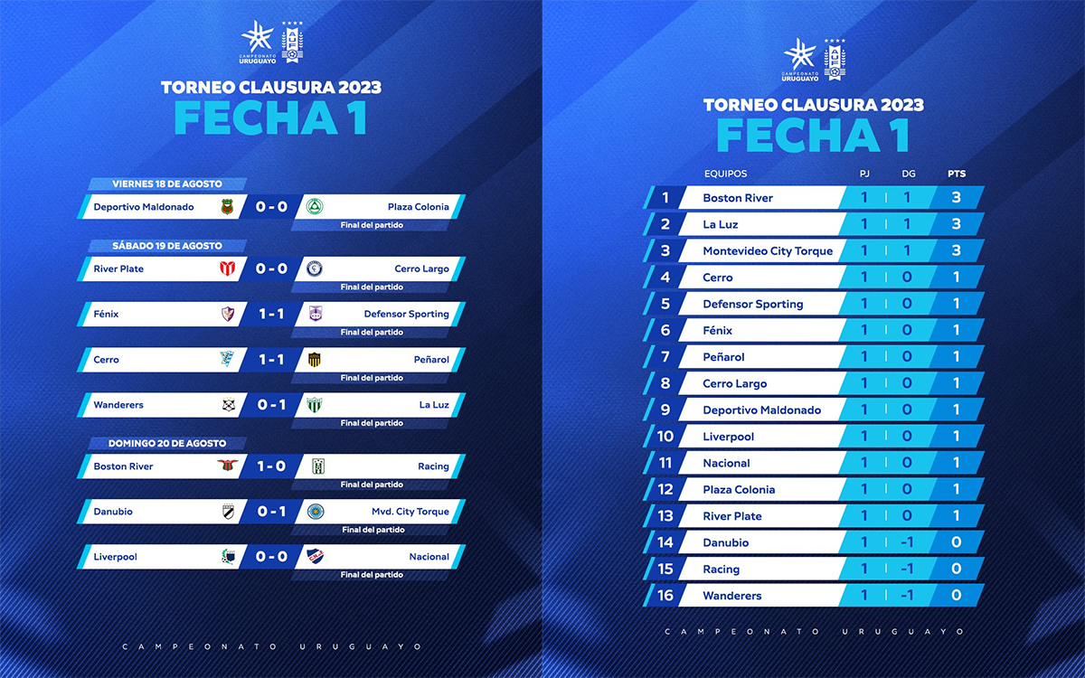 Pour le reste, les seuls vainqueurs de la journée sont des équipes de bas de tableau avec Torque, Boston River et La Luz. Torque a réussi un vrai hold-up en allant gagner à Jardines en étant réduit à dix contre onze depuis la demi-heure de jeu, sur un but en contre de Tiago Palacios. La Luz s’est aussi imposé en toute fin de match contre Wanderers, entraînant une interview au bord des larmes de son entraîneur à la fin du match. C’est cette émotion que l’on retiendra. Car il y a encore eu beaucoup de départs cette semaine avec notamment celui de Boselli du Defensor vers l’autre River Plate, qui vient après celui de Mateo Ponte au Brésil, d’Andrés Ferrari en Espagne pour ce qui est des jeunes. Du côté des moins jeunes, Maxi Cantera est parti en Colombie pour faire partie de l’équipe type d’un tour éliminatoire de Copa Libertadores.