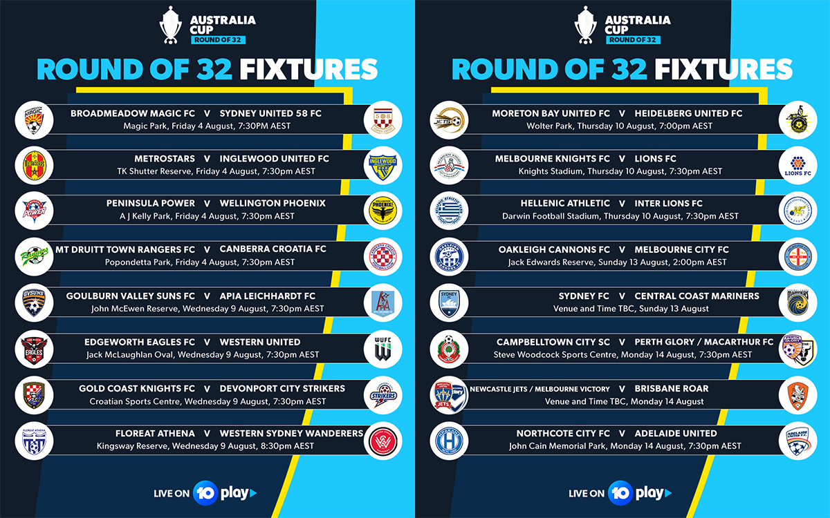 À noter enfin que comme de tradition, les quatre derniers de la saison régulière 2023 s’affrontent pour l’une des deux places restantes en seizièmes de finale. Newcastle Jets accueillera ainsi Melbourne Victory alors que Perth défiera le tenant du titre, Macarthur FC. Le vainqueur du premier match accueillera un autre pensionnaire de A-League Men en seizièmes, Brisbane Roar, celui du deuxième se rendra à Adelaide pour y défier Campbelltown City, autre club de NPL.