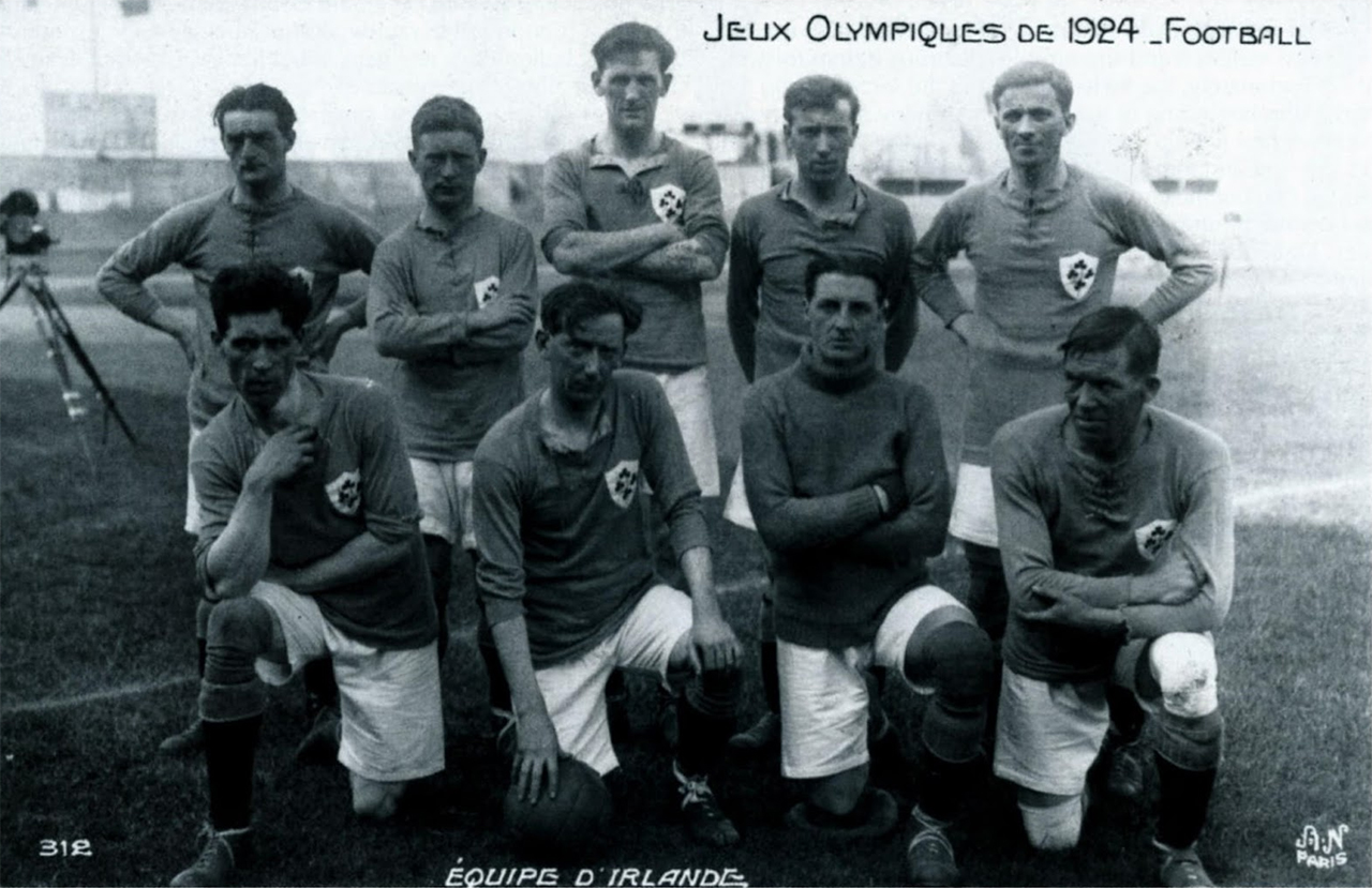L’État libre d’Irlande est nouvellement indépendant et profite de la FIFA pour marquer son indépendance. Entre septembre et octobre 1923, l’Irlande se fait affilier par l’organisme d’Amsterdam et arrive tant bien que mal à se faire accepter par Londres, qui refuse cela dit que des joueurs de l’Ulster participe à cette nouvelle sélection, comme indiqué dans un communiqué du Comité Olympique du Royaume Uni le 1er avril, qui outre-passe largement les prérogatives de ce comité. Dans tous les cas, la presse est extrêmement heureuse de cette participation « Anglo-saxonne », qui est clairement une épine dans le pied dans Anglais. L’Irlande va donc jouer son premier match de compétition en tant que sélection à Paris en 1924, sous réserve de trouver le financement du voyage. Une collecte est donc organisée longtemps à l’avance incluant les contributions de club irlandais (Bohemians, St James Gate, Athlone Town, Shelbourne ou encore Shamrock Rovers). Mais un match amical est aussi joué contre le Celtic Glasgow, devant 22 000 personnes, qui permet de récolter les fonds nécessaires. La compétition de 1924 joue donc un rôle fondamental pour la sélection irlandaise, comme cela a été reconnu récemment par la Fédération. L’équipe arrive tardivement, le 25 mai, étant exonérée de premier tour. Elle arrive par la gare du nord et va déposer le lendemain, à 11 heures, une gerbe sur la tombe du soldat inconnu. Selon L’Auto, l’Irlande joue en maillot bleu avec trèfle vert et les joueurs tiennent fièrement leur drapeau, libres. L’Humanité, qui ne perd pas une seule opportunité de critiquer le tournoi, reproche à l’équipe de ne pas avoir de joueur de la province de l’Ulster, « les meilleurs de la verte érine ».