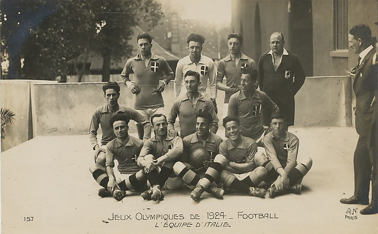 L’Italie fait partie des équipes ayant déjà participé au tournoi de 1920 et qui se sont inscrits très tôt et logiquement au tournoi de 1924. L’équipe se prépare en rencontrant l’Espagne en début d’année (0-0), puis selon L’Auto le Makkabi Budapest début mai à Bologne (1-1) et ensuite l’Austria Vienne, champion d’Autriche 1923/24, appelé à l’époque le SV Amateure (1-1). Le match se déroule à Turin, « en chemin » vers Paris ou l’équipe arrive le 22 mai à la Gare de Lyon. L’Italie fait partie des quelques nations refusant de se joindre au village olympique et l’équipe reste à la villa des italiens à Neuilly Sur Seine. Leur premier match, contre l’Espagne, est le choc du tour préliminaire, le Derby Latin selon la presse. Les Italiens déclarent dans la presse : « Hélas ! Nous débutons contre un adversaire redoutable, un des plus sérieux du tournoi, […] mais nos joueurs tenteront l’impossible pour la victoire ! ». L’Italie joue maillot bleu avec l’écusson de Savoie, culotte blanche.