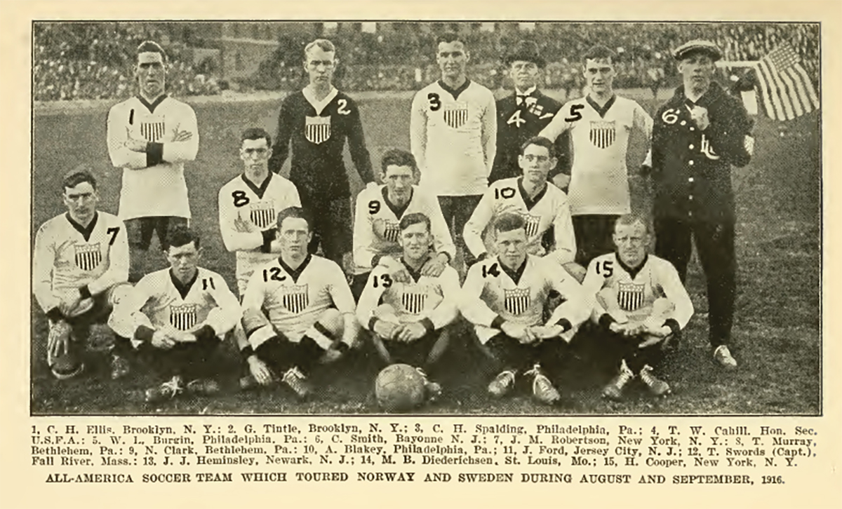 Quand l’Uruguay arrive en 1924 en passant par l’Espagne, la presse locale fait écho du premier match d’une équipe américaine en Europe. C’est faux, puisqu’une équipe américaine a déjà connu une tournée victorieuse en 1916 entre la Suède et la Norvège. En février 1916, Fédération Américaine de Football Association reçoit une invitation à venir jouer durant l’été, financement inclus. Les Suédois cherchent d’abord à inviter le club Bethlehem Steel, mais ces derniers ne veulent pas prendre de risque en pleine guerre mondiale alors que leur usine exporte de l’acier en Europe. Selon le site ussoccerhistory.org, quatorze joueurs sont sélectionnés sur la base des connaissances des membres de la fédération et forment une « All-America Team » emmené par Thomas Cahill, le secrétaire national. Tous les joueurs sauf dont sont nés aux États-Unis. L’équipe arrive à Stockholm le 8 août 1916 et, le 15, affronte un combiné de joueurs d’Hammarby, Kamraterna (IFK), Mariebergs et Västerås nommé Stockholm Tigrarna Fotbollklubben. Le stade est plein et le roi Gustav V a fait le déplacement. Le résultat final est de 1-1, résultat encourageant alors que personne n’avait trop confiance en cette équipe et que l’ensemble suédois était grandement favori.