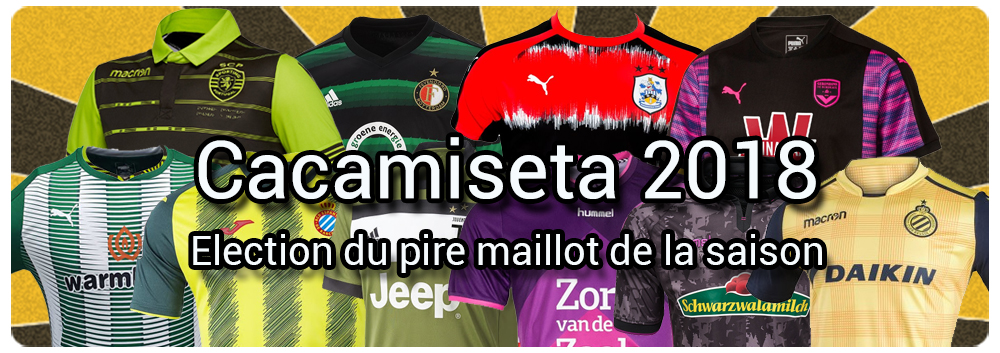 Créée en 2010 et organisée avec les amis des Cahiers du Foot, la Cacamiseta récompense l’audace et le génie des équipementiers qui rivalisent d’effet, parfois (souvent ?) au mépris des couleurs et des traditions historiques, pour habiller avec le plus grand des mauvais goût les clubs et contribuent en grande partie à permettre aux ophtalmologistes de France d’assurer un taux de remplissage des salles d’attente supérieur à celui d’un nouveau stade construit en France. Après la traditionnelle présentation, place désormais à la sélection 2018.