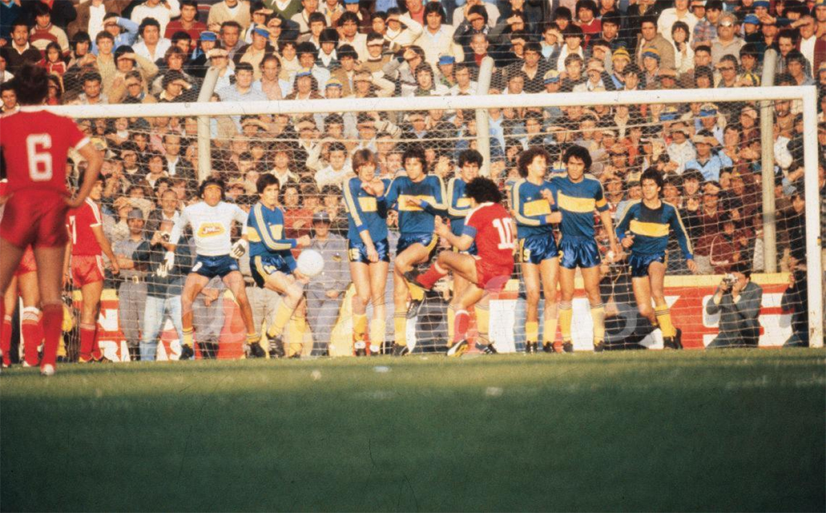 Diego est lancé. Trois minutes plus tard, il est de nouveau fauché par Abel Alves, sur le coup franc, Silvano Espíndola donne l’avantage au Bicho. Malgré une défense de Boca qui surveille Maradona de près, le génie argentin continue à influer sur le jeu, génère des dangers. Mené au score, Boca est contraint d’intensifier son attaque, mais souffre d’un manque de précision ainsi que d’un marquage parfois douteux face à son adversaire. À la 32e minute, Zanabria obtient un coup franc à l’entrée de la surface et égalise d’une frappe puissante. À cinq minutes de la pause, Oscar Ruggeri fauche Maradona. Le numéro 6 xeneize est averti par l’arbitre de la rencontre, Juan Carlos Loustau, mais il commet une nouvelle faute quelques instants plus tard sur Diego et se voit sermonné par l’arbitre, l’expulsion n’est pas loin. Le coup franc est très excentré sur la droite. Maradona prend le ballon et observe Gatti. Pour le commun des mortels, il n’y a pas d’angle pour un tir direct, un centre est le choix logique. Mais Maradona n’était pas un joueur ordinaire. Il frappe directement le coup franc et le dépose dans la lucarne droite de Gatti. 3-2 en faveur d’Argentinos. Le but est tellement impressionnant que même les supporters de Boca applaudissent !