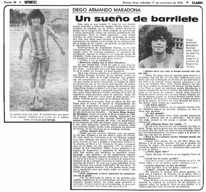« Cet article est une illusion ». Le 17 novembre 1976, Horacio Pagani, journaliste pour Clarin, se rend au terrain d’entraînement d’Argentinos Juniors pour aller y rencontrer un gamin de seize ans dont tout le monde parle, un certain Diego Armando Maradona.
